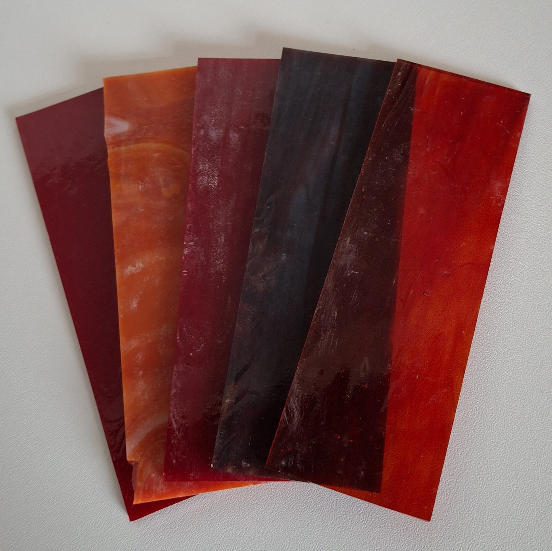 Elke glasplaatje is uniek Dit komt omdat de glasplaatjes uit een grotere plaat worden gesneden en elke grote glasplaat ook weer een verschillend patroon en kleur heeft. Dit komt door het productie proces.