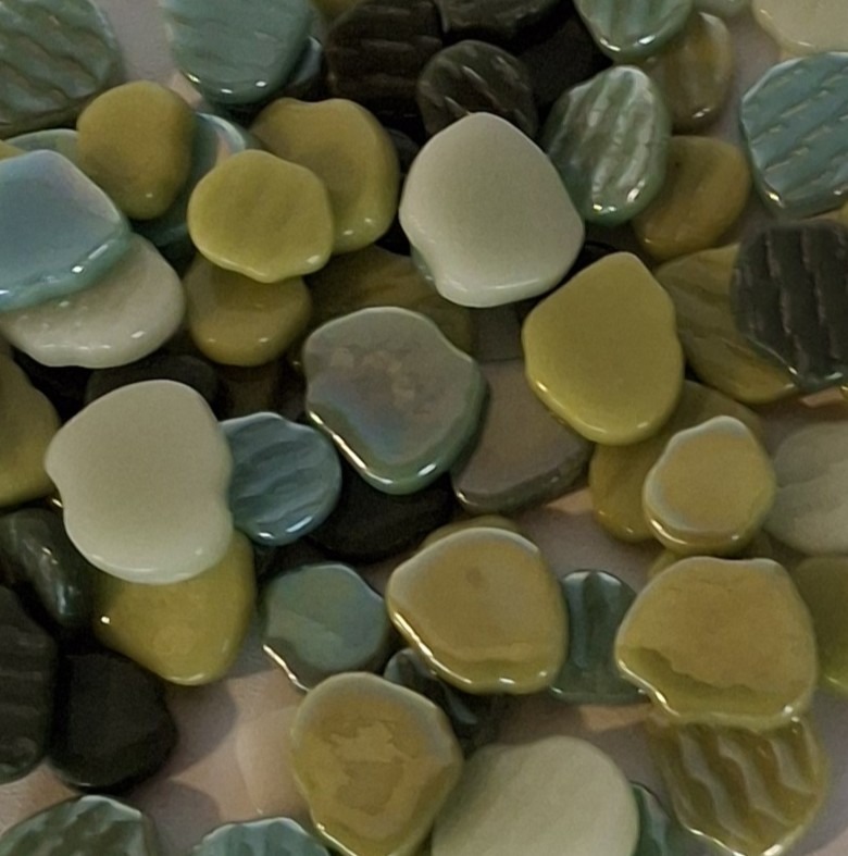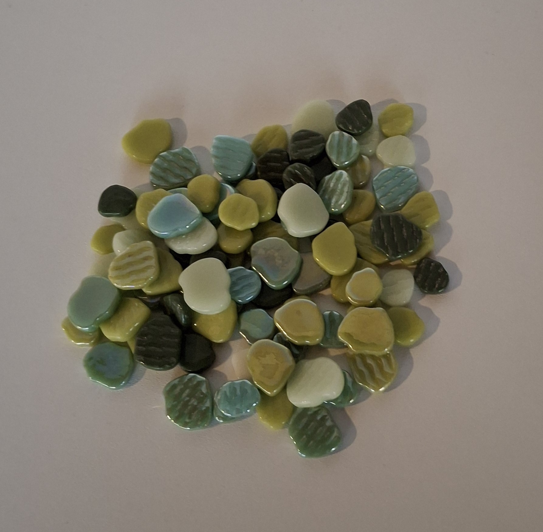 Steentjes zijn ongeveer 4 mm dik In 250 gram zitten ongeveer 175 stukjes.