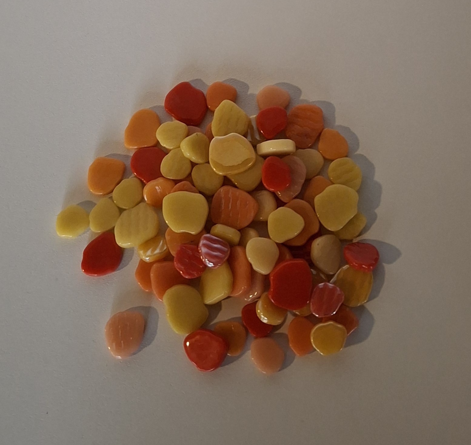 Steentjes zijn ongeveer 4 mm dik  In 250 gram zitten ongeveer 175 stukjes.